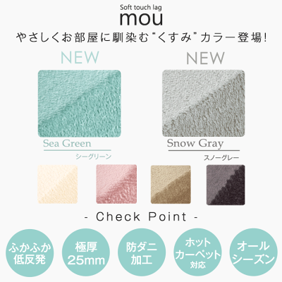 【スタッフつっちーのおすすめポイント!】 ・じんわり気持ちいい低反発ラグ!・思わずほおずりしたくなるなめらかな触り心地・毛足が短いのでお掃除が簡単 ・防ダニ加工済み・床暖房、ホットカーペット対応重量約6kg素材表地:ポリエステル100% 目付け:180g/m2パイル長さ:約4mm(防ダニ加工済み)裏地:不織布200g/m2(花柄滑り止め付) 中材:20mm低反発ウレタンフォームカラーブラウン、グリーン、チャコールグレー、アイボリー、ラベンダー、モカベージュ、スノーグレー、シーグリーン梱包サイズ75×50×35cm生産国中国送料【全国送料無料】 お手入れ方法 ※汚れた場合、洗濯用洗剤を染み込ませた布でたたき洗いするか、つまみ洗いしてください。