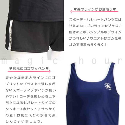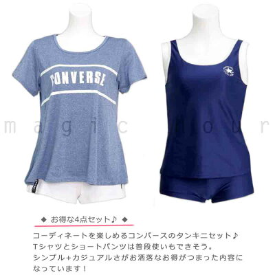 ◆ CONVERSE コンバース 水着 レディース ガールズ タンキニ 体型カバー 4点 セット セパレート お洒落 ブランド フィットネス ジム ブルー ホワイト ◆ カジュアルデザインが使いやすい人気ブランドのカバーアップタンキニセット! スイムウェアをメインに製造している国内メーカーの商品♪
