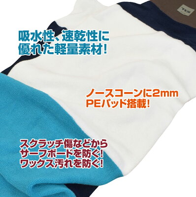 商品説明 ・ノーズから差し込むベーシックタイプ ・ノースコーンに2mmPEパッド搭載 ・伸縮性が高くサーフボードを収納しやすい ・吸水性、速乾性に優れた軽量素材 ・ドローコード式 ・スクラッチ傷などからサーフボードを防ぐ ・ワックス汚れを防ぐ ・ハードケースのインナーにもオススメ ※「ショートボードモデル」「ファンボードモデル」からお選びいただけます。