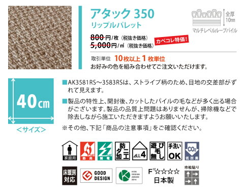 【送料無料】 東リ タイルカーペット ファブリックフロア アタック350 リップルパレット 敷くだけ ズレない 床暖 AK350 40cm パネルカーペット 全16色 [ご注文は 10枚以上から]
